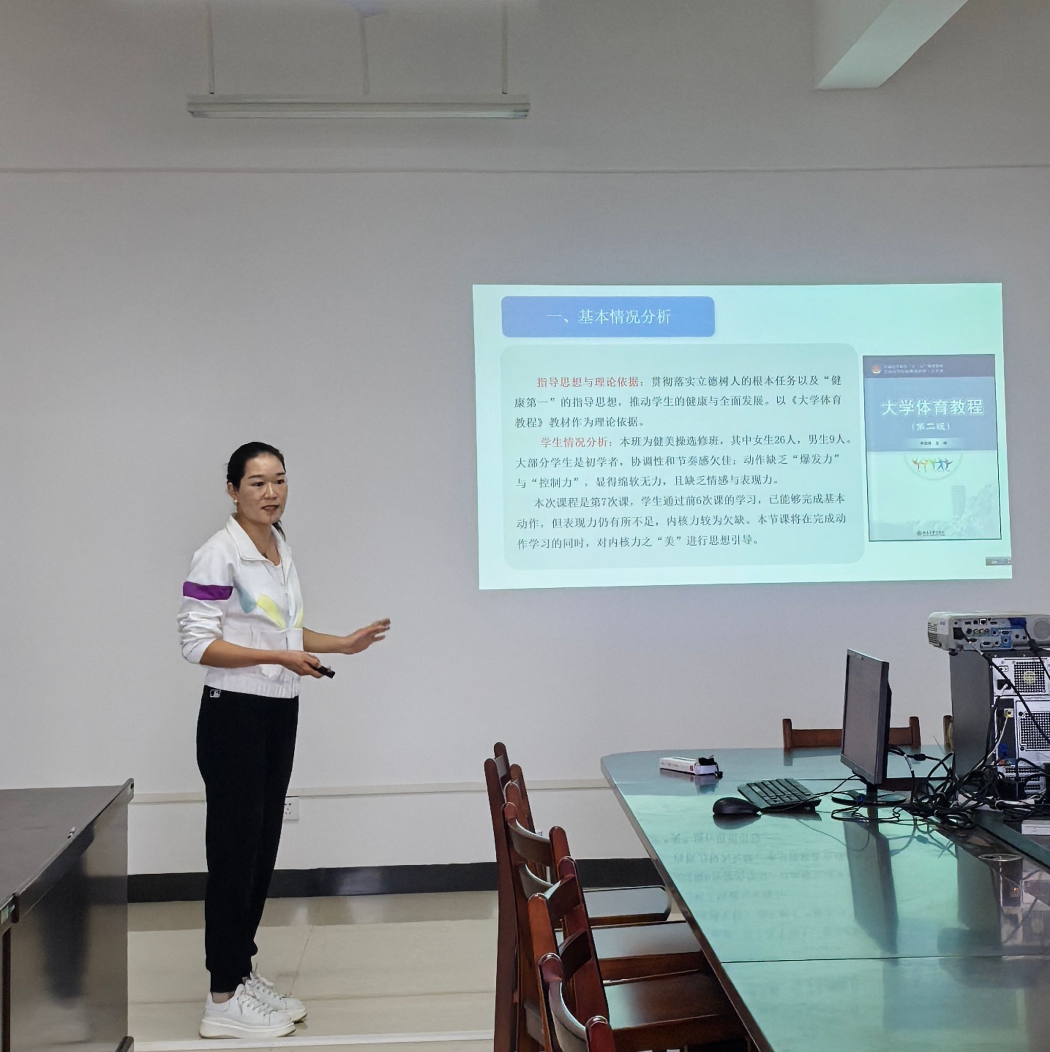 参与健美操项目的教师在首轮基础上,结合评委反馈系统优化了说课方案。围绕思政融合的自然性与实效性,教师重构了教学逻辑,凝练了课程特色,精选了典型案例,将团队凝聚力、审美情趣等思政元素有机融入技能教学与实践环节,展现出教学设计及思政内涵的显著提升。