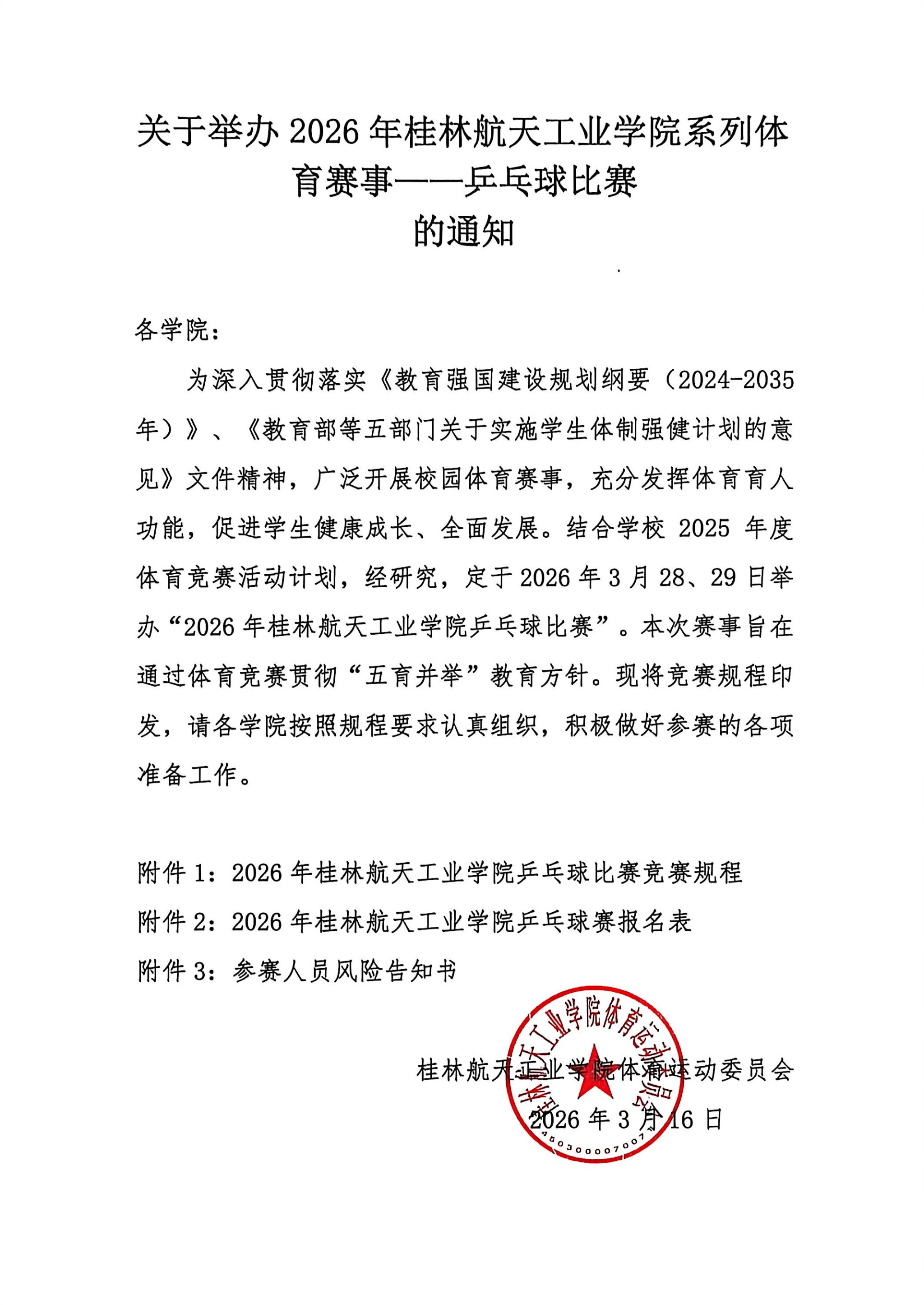关于举办2026年桂林航天工业学院系列体育赛事——乒乓球比赛